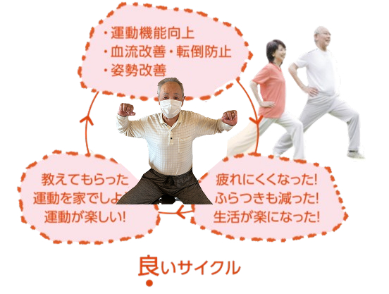 介護と医療その他の事業が連携し、利用者様が求める生活の質と動作の維持・向上を行えるよう、個々の運動内容と生活環境を考えた包括的なサービスを元気と笑顔で実行する「日本一楽しい」介護事業を目指す。