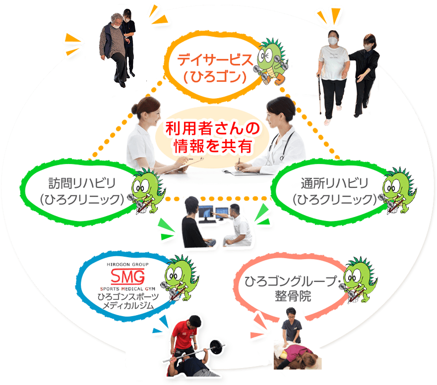 運営母体が医療法人で、クリニック・整骨院・メディカルジムなど、医療全般を取り扱っています。デイサービス・ひろゴンはその中のデイサービス事業を担っております。このような運営体制なので、医師や他の医療機関との連携がスムーズに行なえ、資格の垣根を超えた情報交換も活発な環境です。