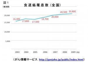 大阪府の食道癌症例は1975年には500 弱であったが、その後次第に増加していき、32年後の2007年には1,300 症例となり、その間に2.5倍増えたことになっています。この漸増傾向は全国でも同様でありまして、2003年に16,400例であったものが7年後の2009年には20,800例となっています。(図1)しかし、重要なことはこうした値の変化が罹患数の変化の実態を捉えているとするには問題が多く、上記のように2004年から始まった癌登録に関する研究推進の間に、各地域におけるがん診療連携拠点病院の指定による院内がん登録の整備、DPC病院における地域医療指数に地域がん登録への参画が記載されたことによる届出数の継続的な増大が変化の主要因と考えられており、直近の2009年の罹患数は登録制度の整備を受けて、より実数に近い値になってきていると解釈するのが妥当と思われます(図1)。すなわち、年間に約2万例の食道癌症例が発生しているとするのが現状です。